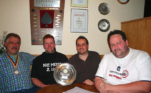 Da war die Freude riesengroß. „Nie mehr zweite Liga“, sangen die Mitglieder der zweiten Mannschaft des Skatvereins PikAs. Seit zehn Jahren arbeiten Achim Morjan, Hartmut Seeber, André Willerberg und Harald Pelka (v.l.n.r. nicht dabei: Uli Riemann) am Aufstieg in die Bundesliga. Jetzt hat es geklappt. Dass es ausgerechnet im Jubiläumsjahr (der Verein besteht seit 50 Jahren) gelungen ist, machte die Freude umso größer. Die Skatfreunde feierten ausgelassen im Vereinslokal Haus Schulte-Mattler.