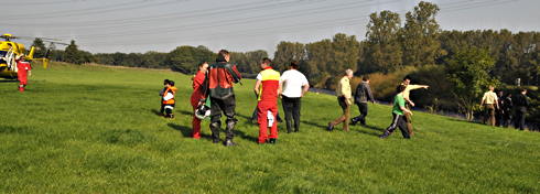 Zum Glück führte einer der Männer ein Handy in einem wasserdichten Behälter mit und konnte so die Polizei verständigen. Die Aufregung führte dann aber zu einem entscheidenden Fehler: der Mann meldete, dass sie sich in der Nähe einer Autobahnbrücke der A 3 befinden würden. Also rückten die Einsatzkräfte aus Hünxe und Drevenack, sowie ein mit Tauchern besetzter Hubschrauber aus Duisburg und ein Rettungshubschrauber aus Köln in Richtung A 3 aus. Erst ein erneuter Rückruf beim Vater brachte die Feuerwehr auf die richtige Spur. Die Hubschrauber flogen sofort die Lippe in Richtung Dorsten entlang und entdeckten schließlich die vier völlig durchnässten Personen auf ihrer kleinen Insel. Daraufhin wurde die Dorstener Feuerwehr und Rettungsdienst alarmiert.