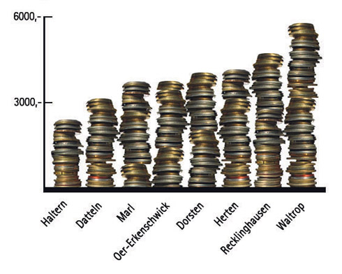 Dorsten verbesserte sich um einen Platz auf 5 mit 4081 Euro (270 Euro mehr). Gefolgt von Recklinghausen auf Platz 6 mit 4202 Euro (660 Euro mehr), das sich damit um zwei Plätze verschlechterte. Herten bleibt auf Platz 7 mit einer Verschlechterung um 700 Euro auf 4598 Euro vor dem Schlusslicht Waltrop.