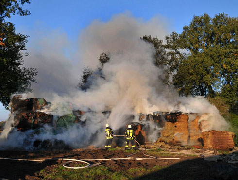 Marl. Es brannte lichterloh: Heute morgen um kurz vor neun rückte die Marler Feuerwehr mit drei Löschzügen zur Straße Am Hofe aus. Schon von weitem erkannten die Rettungskräfte eine riesige Rauchsäule. Ein großer Stapel Strohballen war in Flammen aufgegangen.