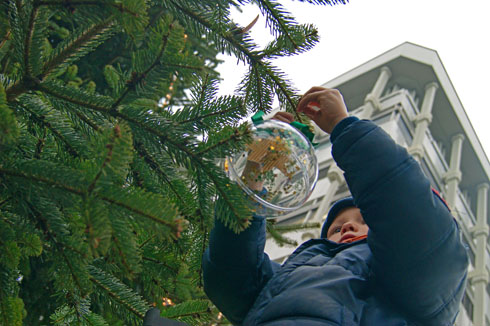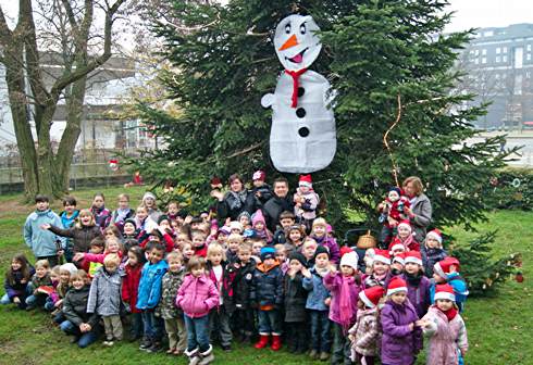 Zum zehnten Mal schon lud die Stadt zur Schmückaktion, an der diesmal sechs Kindergärten beteiligt waren. Zunächst begrüßte Bürgermeister Werner Arndt die Akteure im Ratssaal. Die Grundschule Sickingmühle unterhielt dann mit Advents- und Weihnachtsliedern, bevor es zum Schmücken vor die Tür ging.