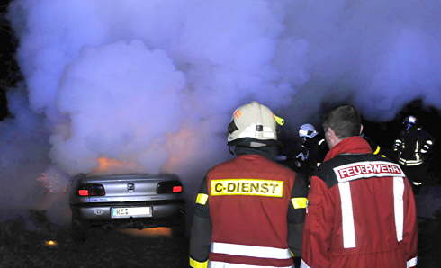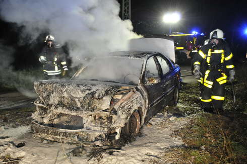 Mit Atemschutz ausgerüstet wurde der brennende Wagen von den Einsatzkräften gelöscht. Glücklicherweise befand sich niemand mehr im Fahrzeug, denn dieser brannte vollständig aus. Da auch sonst weit und breit kein Fahrer anzutreffen war, wurde der Halter von der Polizei zu Hause aufgesucht. Er gab an, den Wagen dort bereits am vergangenen Dienstag nach einem Unfall abgestellt zu haben. Der Opel Vectra wurde von der Polizei noch in der Nacht sichergestellt. Die Ermittlungen dauern an. Fotos: Bludau