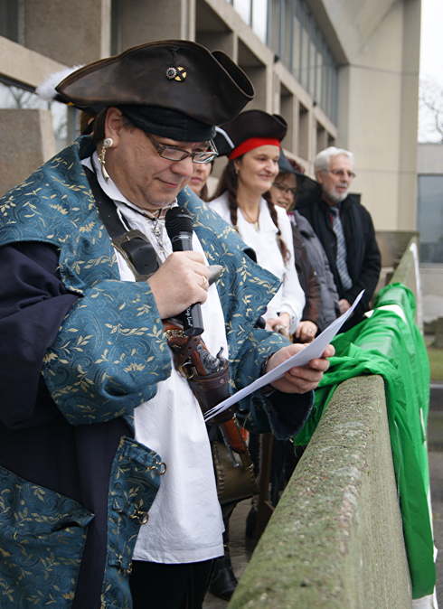 Die Piratenflagge flattert im Wind. Mit Spitzhut, Augenklappe und Degen steht die Mannschaft an der Reling und betrachtet die versammelte Menschentraube, die ihre Chance auf Beute wittert. Doch der Oberpirat in Person des Marler Bürgermeisters Werner Arndt wehrt sich vehement: „Sucht euch ein and’res Schiff zum Kentern. Uns’ren Kahn werdet ihr nicht entern.“ (Bild oben).