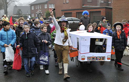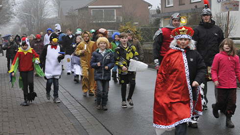 Trotz des nass kalten Wetters zogen auch die Lembecker Grundschulkinder der Don-Bosco-Schule durch die Straßen von Lembeck (Bilder oben und unten). Geordnet nach Klassen ging es für die kleinen Jecken mit ihren Lehren in einfallsreichen Kostümen von der Schule aus in Richtung der Geschäftsstraße, bis hin zum Altenheim an der Schulstraße. Die kleinen Prinzessinnen, Frösche oder Könige sammelten mit Begeisterung Kamelle ein, die von den Zuschauern geworfen wurden.