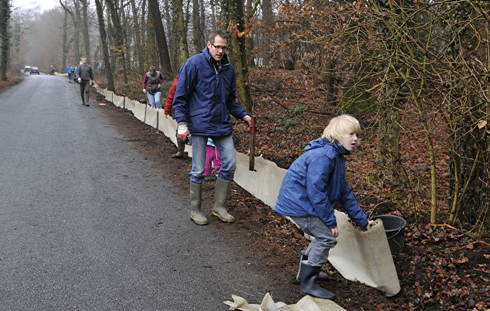Diese Maßnahme sichert das Überleben von hunderten Amphibien. Erwachsene zusammen mit ihren Kindern stellten in stundenlanger ehrenamtlicher Arbeit den über 600 Meter langen Schutz auf, der wandernde Frösche, Molche und Kröten vor dem Verkehrstod schützen soll. Die Tiere laufen entlang der Planen und fallen dann in Eimer, die in regelmäßigen Abständen auf der anderen Straßenseite geleert werden.