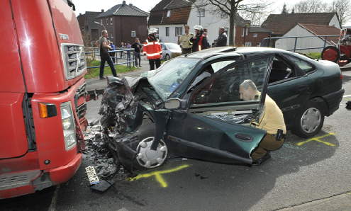 Datteln/Oer-Erkenschwick. Auf der Recklinghäuser Straße in Datteln, in Höhe der Ahsener Straße, krachte heute am frühen Nachmittag ein 20-jähriger PKW-Fahrer aus Oer-Erkenschwick frontal in einen Lastwagen. Für den jungen Mann kam jede Hilfe zu spät.