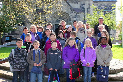 Nach der Frühstückspause vor der St. Martinus-Kirche ging es auf einen Trip durch das Alte Dorf Westerholt. Als Stadtführer zeigte Triffterer den Kids das Stadtwappen, das auf einem Gullydeckel zu sehen war. Ein paar Meter weiter warfen die wissbegierigen Schüler von außen einen Blick auf die Trafostation. Hier mahnte Ludger Triffterer zur Vorsicht: "Die Spannung in der Trafostation bedeutet Lebensgefahr!" Auf der Weiterfahrt zur Zeche Ewald wurde noch ein Zwischenstopp am Umspannwerk in Westerholt eingelegt, in dem der Strom von Hoch- auf Mittelspannung transformiert wird.