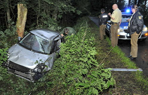 Nach Aussage des 57-Jährigen, war das Fahrzeug so schnell, dass er noch nicht einmal erkennen konnte welche Farbe das Fahrzeug hat. Mit unverändert hoher Geschwindigkeit fuhr der Verursacher weiter, verlor aber nur weniger hunderte Meter weiter, in der nächsten Linkskurve, auf der leicht feuchten Strasse die Kontrolle über seinen Suzuki Swift. Der Kleinwagen drehte sich um die eigene Achse, schleuderte in den Straßengraben und überschlug sich mehrfach. Der Fahrer schaffte es aus dem Wrack zu klettern und zu flüchten.