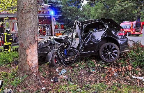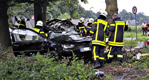 Dorsten. Am Donnerstagabend verlor im Dorstener Ortsteil Lembeck der Fahrer eines VW Golfs die Kontrolle über seinen Wagen. Auf dem Lasthausener Weg schleuderte Wagen mit hoher Geschwindigkeit gegen mehrere Bäume. Die Insassen, ein junges Pärchen (17, 18) wurden eingeklemmt und schwerst verletzt. Nach der notärztlichen Erstversorgung wurden sie durch die Feuerwehr mit hydraulischem Rettungsgerät aus dem Wrack befreit. Ein Rettungshubschrauber flog den 18-jährige Fahrer aus Dorsten in eine Unfallklinik, wo der junge Mann an den Folgen seiner Verletzungen verstarb. Die 17-jährige Beifahrerin, ebenfalls aus Dorsten, wurde in ein Krankenhaus transportiert.
