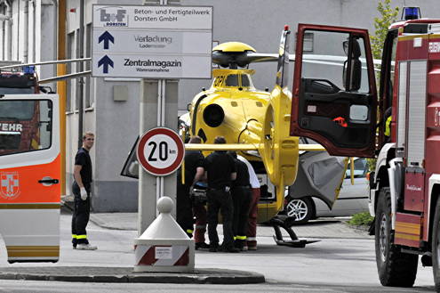 Bei Lackierarbeiten einer rund 20 Tonnen schweren Stahlbetonplatte kippte das Element um und begrub den Mann unter sich. Noch vor Eintreffen der alarmierten Feuerwehr gelang es seinen Kollegen, den Leiharbeiter zu befreien. Feuerwehr und Rettungsdienst kümmerten sich um den Schwerverletzten und sicherte die Landung des Rettungshubschraubers Christoph 8 ab. Aufgrund der lebensbedrohlichen Verletzungen wurde der Arbeiter in die Unfallklinik Dortmund-Nord geflogen.