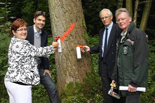 Bild v. li.: Carola Geiß-Netthöfel, Regionaldirektorin des RVR, Bürgermeister Dr. Uli Paetzel, Joachim Ronge, Geschäftsführer der AGR und Matthias Klar, RVR Ruhr Grün, markieren den ersten Baum der aufzuforstenden Fläche.