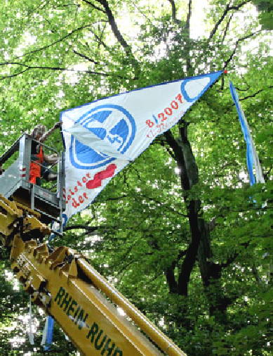Herten. Für eine außergewöhnliche Rettungsaktion sorgten die Mitarbeiter des städtischen ZBH (Zentraler Betriebshof Herten) heute im Schlosspark. Der etwa drei Meter große Schalke-Drachen von Alfred Mensing hatte sich einige Tage zuvor in einem Baum verfangen und konnte ohne fremde Hilfe nicht mehr befreit werden.