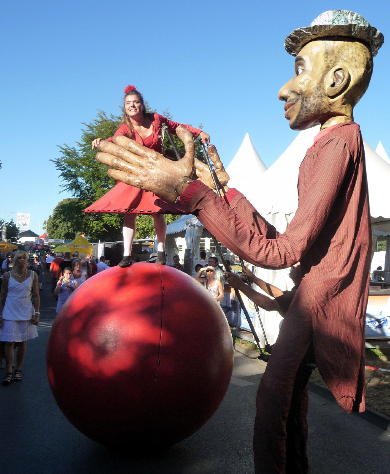 Bild: Die vier Meter hohe Marionette Pablo und die Ballerina Atharian, die sich sicher auf einer zwei Meter großen Kugel bewegt, zogen mit ihrer Straßenshow kleine und große Zuschauer in ihren Bann.