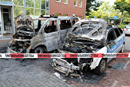 Dorsten. In der vergangenen Nacht brannten zwei Einsatzfahrzeuge der Polizei vor der Wache am Wulfener Markt in Dorsten ab. Gegen 1.30 Uhr hatten Anwohner bemerkt, dass die Fahrzeuge in hellen Flammen standen und alarmierten die Polizei. Die Beamten konnten laut Auskunft von Polizeisprecher Michael Franz kurze Zeit später in unmittelbarer Tatortnähe einen 44-jährigen Dorstener festnehmen. Die Ermittlungen laufen. Fest steht, dass der Dorstener unter Alkoholeinwirkung stand. Zu weiteren Tatumständen gibt die Polizei derzeit keine Auskunft. Die Feuerwehr hat den Brand gelöscht, konnte aber nicht verhindern, dass beide Autos völlig zerstört wurden. Auch entstand Sachschden am Gebäude der Polizei. Diese gibt den Gesamtschaden mit 100.000 EUR an. Foto: Bludau