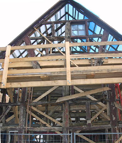 Anschein hat. Dabei ist die Westfassade schon ziemlich angegriffen, aber auch dort ist noch sehr viel, was gerettet werden kann. Versuchen Sie mal, einen der alten “morsch” erscheinenden Balken zu sägen: Sie werden sich ziemlich abmühen, denn die Kerne sind absolut hart, wenn es nicht die sind, wo immer Wasser hingekommen ist und die damit wirklich durch sind.“