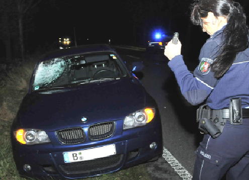 Schermbeck. Ein kapitaler Hirsch sorgte am Montagabend für einen schweren Wildunfall auf der B 58 im Bereich Schermbeck-Damm. Ein 36-jähriger Essener befuhr gegen 21 Uhr die B 58 (Weseler Straße) in Fahrtrichtung Wesel, als es nach Aussage des Fahrers plötzlich einen heftigen Aufschlag gab. Durch den Zusammenprall mit dem mächtigen Wild, zersprang die Frontscheibe und die 35-jährige Beifahrerin wurde durch herum fliegendes Glas leicht verletzt. Das Tier überlebte den Zusammenprall nicht. Fotos: Bludau