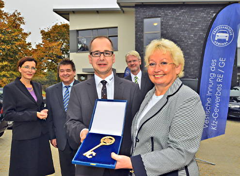 Dafür gab es von der Fachfrau Lob für die Stadt Marl (für die gute Zusammenarbeit) und für das General-Bauunternehmen Borgers, das die Arbeiten in einem atemberaubenden Tempo zu Ende gebracht hat. Marls Bürgermeister Arndt hatte sich von Anfang an sehr für das Projekt eingesetzt. Für ihn war das Vorhaben der Kfz-Innung eine „zukunftsweisende Investition“ für das Handwerk und den Standort Marl. Das Schulungszentrum unterstreiche Marl als Automotive-Standort, sagte er auf der Eröffnungsfeier.
