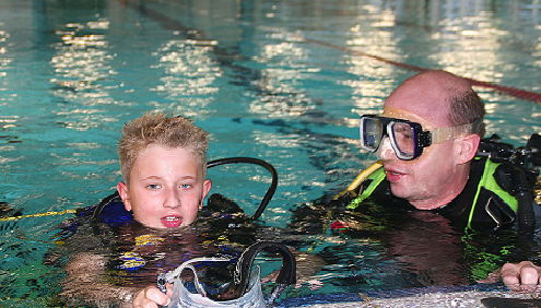 Im Schnorcheln ist der Neunjährige schon ein kleiner Profi. Aber der Tauchgang mit Weste, Druckluftflasche und Atemgerät ist für ihn eine Premiere. Noah hingegen kennt das Prozedere schon gut: Der Neunjährige hat beim Schnuppertauchen schon dreimal die Gelegenheit genutzt auf Tauchstation zu gehen. Mit leuchtenden Augen schält er sich nach dem Unterwassergang aus der Ausrüstung. Am Beckengrund haben die beiden Jungs mit ihren Tauchlehrern sogar Frisbee gespielt – das finden die zwei besonders „cool".