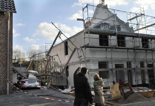 Die Windböen am Sonntagmittag rissen zwei Giebelwände eines Neubaus an der Borkumer Strasse in Marl im Neubaugebiet Loe-Auen um. Dabei fiel eine Wand auf das Nachbargrundstück und den Audi in der Garageneinfahrt. Das Fahrzeug wurde völlig zerstört. Personen kamen nicht zu Schaden.