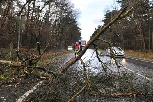 Feuerwehreinsatz auch in Dorsten auf der B 58 in Höhe des Tüshausweg. Gegen 9.15 Uhr krachte ein Nadelbaum aus dem angrenzenden Waldgebiet auf die Bundessstrasse. Die Dorstener Feuerwehr sicherte zusammen mit der Polizei zunächst die Einsatzstelle ab. Mit Hilfe einer Kettensäge wurde der Baum dann fachmännisch in handliche Stücke zerkleinert und zur Seite geschafft. Fotos: Bludau