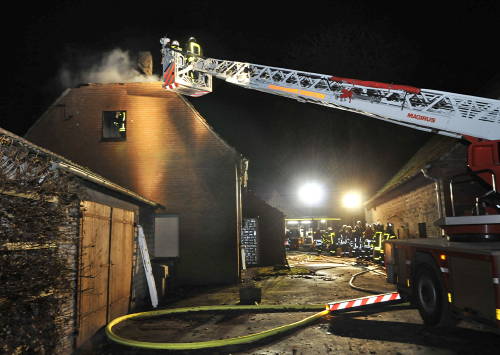 Als die ersten Kräfte in der Nacht zu Donnerstag den abgelegenen Bauernhof erreichten schlugen die Flammen in den nächtlichen Himmel. Ein Teil des Dachstuhls und die darunter liegende Wohnung brannten. Alle Hausbewohner konnten sich noch vor dem Eintreffen der Feuerwehr unverletzt in Sicherheit bringen.
