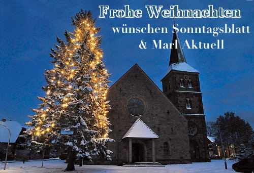 Das Weihnachtsbild zeigt den Lichterbaum vor der Mathäuskirche in Dorsten-Wulfen.