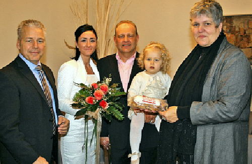 Martin Groll (l.), Leiter des Standesamts, und Standesbeamtin Birgit Arns (r.) überreichten den frisch verheirateten Eheleuten, Julie Mander und Volker Marzinowsky, einen Weihnachtsstollen. Wie in den vergangenen Jahren machte die Stadt Recklinghausen auch 2012 allen Brautpaaren, die am letzten möglichen Tag des Jahres heiraten, zur Hochzeit eine zusätzliche Freude. Das kleine Geschenk wurde von Bürgermeister Wolfgang Pantförder gespendet als Einstimmung auf das Weihnachtsfest.