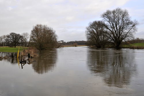 Vest. Die Hochwasserlage an der Lippe hat sich etwas entspannt. Trotzdem ist der Fluss in eigenen Bereichen imposant angestiegen. Einige ufernahe Felder und Wiesen sind bereits überschwemmt.