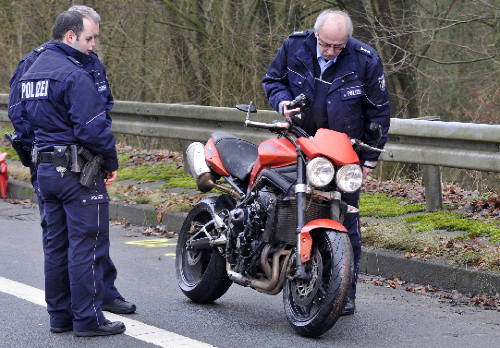 Auf der nassen Fahrbahn hatte der Fahrer zunächst zwei PKW überholt und wollte sich wieder rechst einordnen. Dabei geriet er ins Schleudern und rutschte mit dem Krad rechts in die Schutzplanken. Eine Berührung mit anderen Fahrzeugen fand nicht statt. Die Triumph Street Tripple rutschte dabei rund 200 Meter weit.