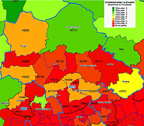 Die Entwicklung im Vergleich zum Vorjahr zeigt, dass fast überall im Kreis die Schuldnerquote ansteigt. Voll im roten Bereich liegen Recklinghausen (Postleitzahlen 45661 und 45663), Marl (45770) und Herten (45699) sie liegen zwischen 16,53 und 14,31 Prozent. Am besten schneidet Haltern ab (45721) mit 7,26 Prozent vor Waltrop (45731) mit 9,18 Prozent.