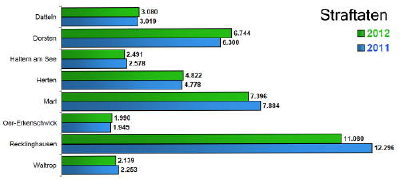 Die Zahl der Raubüberfälle stieg nur geringfügig auf 602, Besonders Marl war im ersten Quartal 2012 von Raubüberfällen auf Geschäfte betroffen. Die Zahl der Wohnungseinbrüche liegt mit 2.628 weiter auf hohem Niveau (zwölf Prozent an der Gesamtkriminalität). „Die Verhütung und Verfolgung des Wohnungseinbruchs ist nach wie vor ein wichtiger Bestandteil der Behördenstrategie“, erklärt die Polizeipräsidentin. Dagegen nahm die Zahl der Taschendiebstähle um über 22 Prozent ab (400 Fälle weniger).