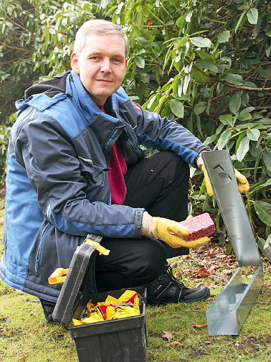 Der Westerholter platziert die Giftköder in städtischen Grünanlagen. Die eckigen, langen Metallrohre liegen solange aus, bis Lammering keine Nagespuren am Giftblock mehr feststellt. Dann weißt er, dass er das Duell gewonnen hat. „Die Anwohner und Spaziergänger müssen sich keine Sorgen machen: Hunde, Katzen oder Kaninchen kommen in diese Röhre nicht rein und der Köder ist fest verankert!“