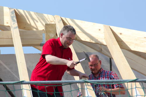 Über 50 Gäste, darunter die zukünftigen Eigentümer der Wohnungen und Nachbarn aus der Distelner Siedlung, feierten den Meilenstein im Baufortschritt. Gemeinsam mit Zimmermeister Werner Schomberg schlug Iproton-Geschäftsführer Lucas Braecklein den symbolischen letzten Nagel ins Dachgebälk. Den letzten Hammerschlag begleitete Applaus: Die Gäste hatten sich vor dem Haus versammelt, um gemeinsam anzustoßen. Die Stadtvilla ist das letzte Projekt in den Goethe-Gärten. Bereits im Herbst sollen die Eigentümer der vier Wohnungen einziehen.
