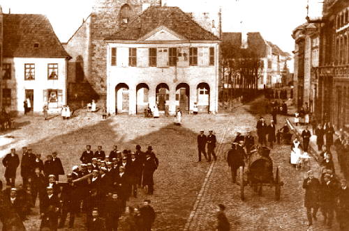 Bild: Feiern 1905: Abiturienten schleppen im Triumphzug einen Elefantenzahn aus der Kamerunsammlung des Großwildjägers von Cloedt zum Petrinum (damals neben dem Franziskanerkloster). Im Gegenverkehr wird Gülle wegtransportiert, eine Abwasserkanalisation gab es erst ab 1908).