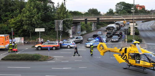 Für die Landung des Hubschraubers wurde der gesamte Kreuzungsbereich von Polizei und Feuerwehr gesperrt. Nachdem das Opfer versorgt worden war, fahndete die Polizei mit einem Großaufgebot nach den beiden Tätern. Nach ersten Zeugenaussagen sollen die beiden Männer einen Hund, einen Mops, mitgeführt haben.