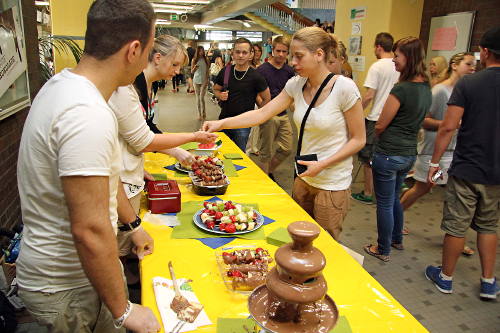 An einem Tag der Klimawoche verstärkten die Schüler die Werbung für Schokolade aus fairem Handel durch den Verkauf von Schoko-Obstspießen. „Durch ihr überzeugtes und überzeugendes Auftreten haben die Schüler ihre Kollegen nachdenklich gemacht“, findet Angelika Bakenfelder.