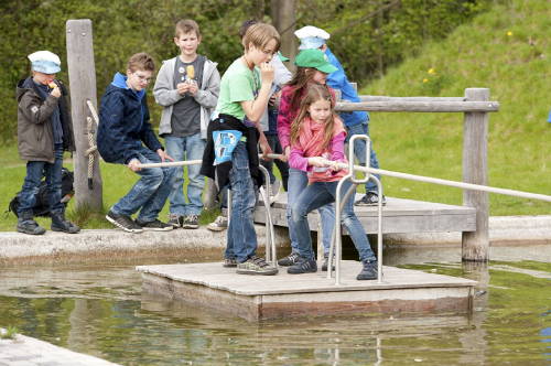 Highlight ist ein künstlicher Wasserlauf mit einem Modell des Schiffshebewerks, in dem die Kinder per Kurbel kleine Flöße auf- und abbewegen können.