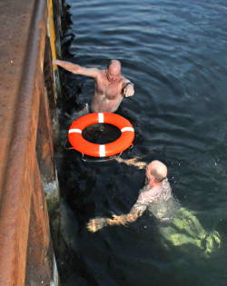Foto: Die Feuerwehrmänner Martin Spiekermann und Matthias Ofiera sprangen zur Rettung in den Kanal (Bild oben und Mitte). Fotos: Bludau