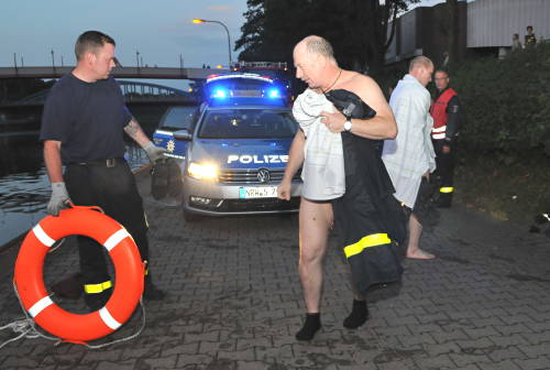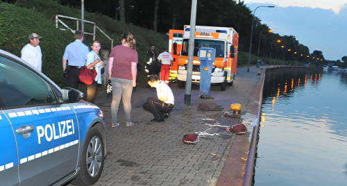 Geistesgegenwärtig sprangen zwei Polizeibeamte in den Kanal, um dem Mann zur Hilfe zu eilen. Da das Opfer schwer verletzt war und die hohe Spundwand überwunden werden musste, war dieses kein einfaches, aber ein gefährliches Unterfangen.