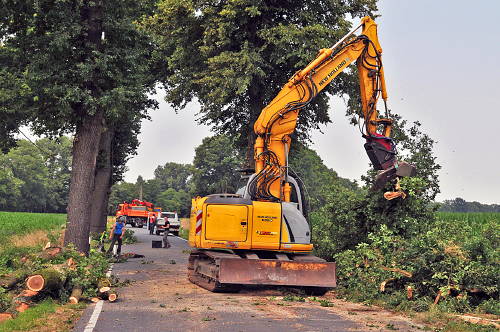 247 Bäume stehen auf der Probe: Linden, Rotbuchen Stieleichen. Sie sind zum Teil über 300 Jahre alt und das ist ein Problem. Wenn sie in der Krone bereits licht sind und sich unten Nottriebe bilden, dann steht es schlecht um die Gesundheit. Wenn Äste herunterfallen und das Befahren der Straße unsicher machen, dann muss der Landesbetrieb Straßen NRW eingreifen. Deshalb greifen seit Wochenbeginn Spezialbagger zu, tragen die Bäume ab und verarbeiten sie zu Hackschnitzel.