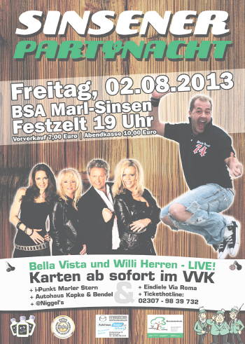 Sinsen. Mit der 1. Sinsener Partynacht stimmt die Sinsener Schützengilde auf ihr diesjähriges Fest ein. Am Freitag, 2. August, geben sich ab 19 Uhr Top-Schlagerstars die Klinke in die Hand: Willi Herren und Bella Vista Live sorgen für Stimmung der Extraklasse und die Orignal DJ’s von „Suberg’s ü30 Party“ sorgen für einen bunten Musik-Mix.