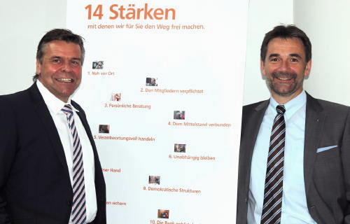 Bild: Die acht selbständigen Volksbanken im nordwestlichen Ruhrgebiet haben das Geschäft mit Mitgliedern und Kunden weiter ausgebaut. Das berichteten Eberhard Kreck (links) und Dr. Peter Bottermann.