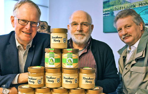 Mit seiner Idee, auf dem Kreishaus-Dach ein Bienenvolk zu beherbergen, stieß Cay Süberkrüb zu Jahresbeginn bei den Imkern auf offene Ohren. Manfred Onnebrink stellte ein Bienenvolk zur Verfügung, Gustav Robering erklärte sich sich gerne bereit, das Volk zu betreuen und den Bienenstock regelmäßig zu kontrollieren. Dass dieses Gemeinschaftswerk den Bienen gefallen hat, zeigt die reiche Ernte. Den Honig haben die Imker dem Kreis gespendet, so dass der Landrat nun bei besonderen Anlässen ein Glas „Kreishaus-Honig“ überreichen kann.