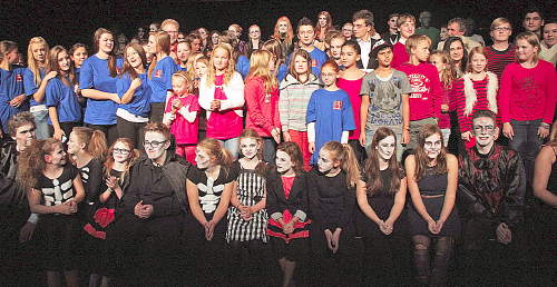 Auch das Musicalprojekt der Erich-Klausener-Schule „Vampire mit Herz und Biss" erhielt den Jugendkulturpreis. Den Titel fand Jurymitglied Freia Lukat sehr passend: „Die Schüler, Eltern und Lehrer waren alle mit Herz und Biss dabei." Sie selbst saß schon bei einer Aufführung des Musicals im Publikum und berichtete bei der Preisverleihung begeistert von diesem Erlebnis. Dass diese Begeisterung gerechtfertigt ist, bewies die Gruppe im Anschluss. Mit schaurigen Kostümen, gruseligen Requisiten und beeindruckenden Gesangsleistungen gaben die Darsteller eine Kostprobe ihres Programms.
