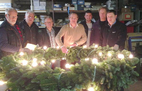 Bild: Der Vorstand der Alt-Marler Werbegemeinschaft gestaltete wieder den Adventskranz, der traditionell zum Weihnachtsmarkt auf dem Kirchplatz aufgehängt wird und die ganze Adventszeit leuchtet. (v.l.) Wolfgang Passmann, Achim Wegner, Bernhard Wüller, Michael Schemberg (Vorsitzender), Merten Freitag, Georg Dornebeck und Jürgen Rentel.
