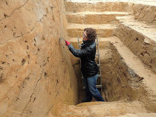 Bild: Die Grabungsleiterin Dr. Bettina Tremmel bei der Arbeit in einer der tiefen Schnittgruben des Lagergrabens.