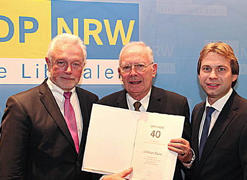 Marl. Für 40-jährige Mitgliedschaft ehrte die Marler FDP auf ihrem Neujahrsempfang Christian Haase (80). Als Experte für Bau und Verkehr sitzt er für die FDP als Sachkundiger Bürger im Stadtplanungsausschuss des Marler Rates. Der stellvertretende FDP-Bundesvorsitzender Wolfgang Kubicki und der Marler Stadtverbandsvorsitzenden Thorsten Leineweber gratulierten dem Jubilar.