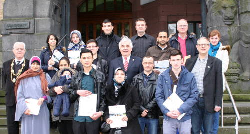 Bürgermeister Ferdinand Zerbst (l.) übergab die Einbürgerungsurkunden elf Neubürgern aus Griechenland, Marokko, der Ukraine und der Türkei.