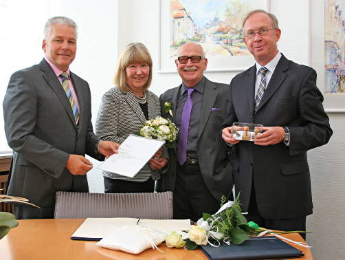 40 Jahre sind Hannelore Rech und Wido Dörnemann schon ein Paar. Geheiratet haben sie in der Zeit aber nicht. Erst als sie hörten, dass Wolfgang Pantförder, den die beiden auch privat kennen, mit seinem Bürgermeisteramt auch die Lizenz zum Trauen abgibt, haben sie sich entschieden, in den Stand der Ehe zu treten. „Ich habe immer sehr gerne glückliche Paare verheiratet“, sagt Bürgermeister Wolfgang Pantförder. „Damals musste ich noch einen zweiwöchigen Kurs an der Personenstands-Akademie absolvieren, bevor ich zum Standesbeamten offiziell bestellt wurde.“