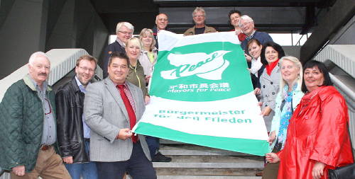 Gemeinsam mit Vertretern der Ratsfraktionen und interessierten Bürgern hisste das Stadtoberhaupt auf dem Creiler Platz die Flagge der „Mayors for Peace“ und erinnerte damit an das Rechtsgutachten des Internationalen Gerichtshofes vom 8. Juli 1996. Nach diesem verstößt der Einsatz von Atomwaffen bzw. die Androhung eines Einsatzes gegen grundsätzliche Prinzipien des humanitären Völkerrechts. Weltweit gibt es immer noch etwa 17.000 Atomwaffen im Besitz von neun Ländern (USA, Russland, China, Großbritannien, Frankreich, Indien, Pakistan, Israel und Nordkorea). Die Abrüstungsverpflichtung des Atomwaffensperrvertrags ist bisher kraftlos geblieben.
